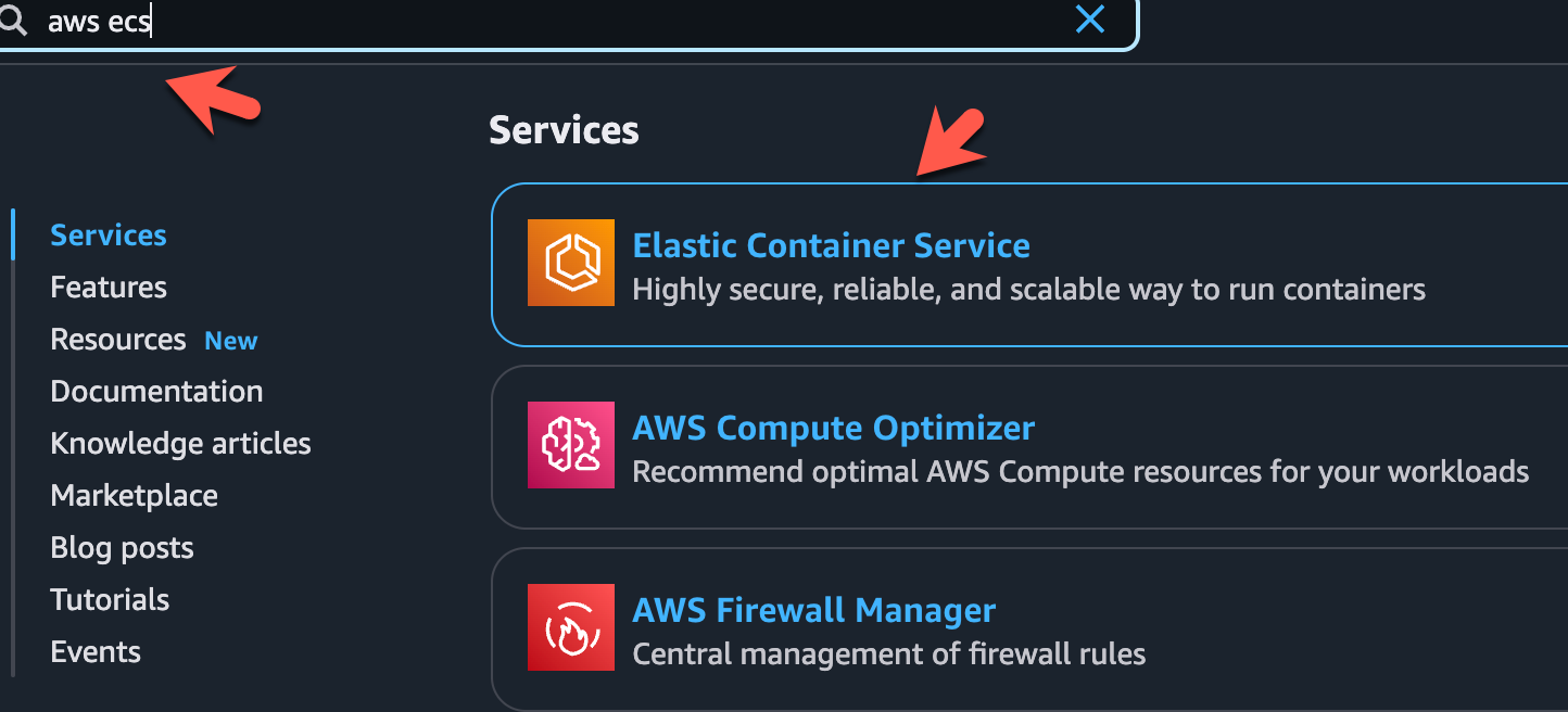 - Within the AWS Portal, search for aws ecs and click the Elastic Container Service service.