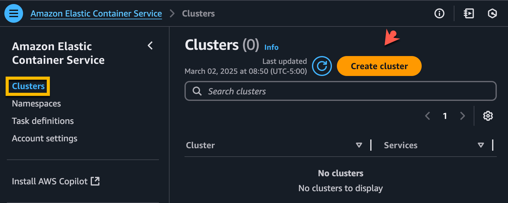 - Within the ECS service, you'll see an option for Clusters in the left pane. Click the Clusters button and then click the Create cluster button.