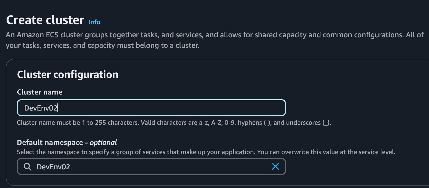 - The first step will be to create a cluster name and optionally, a namespace. The Namespace is just like in Kubernetes - it's a collection of services that make up an application stack.