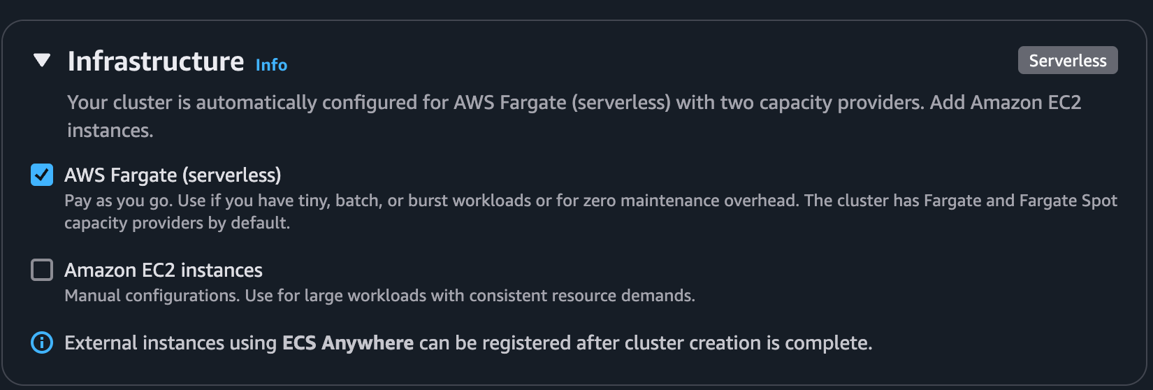 - The second step will be to choose the infrastructure. With ECS, you have two options: