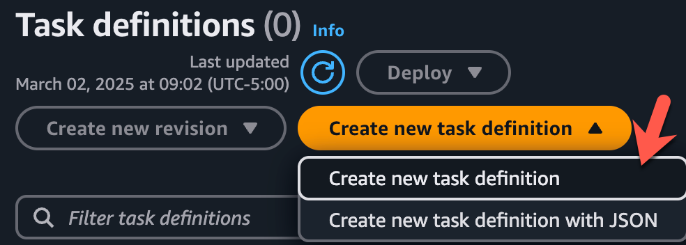 - Choose the Create new task definition button, but you can also do the configuration with JSON if you'd prefer.
