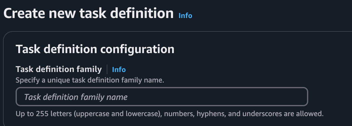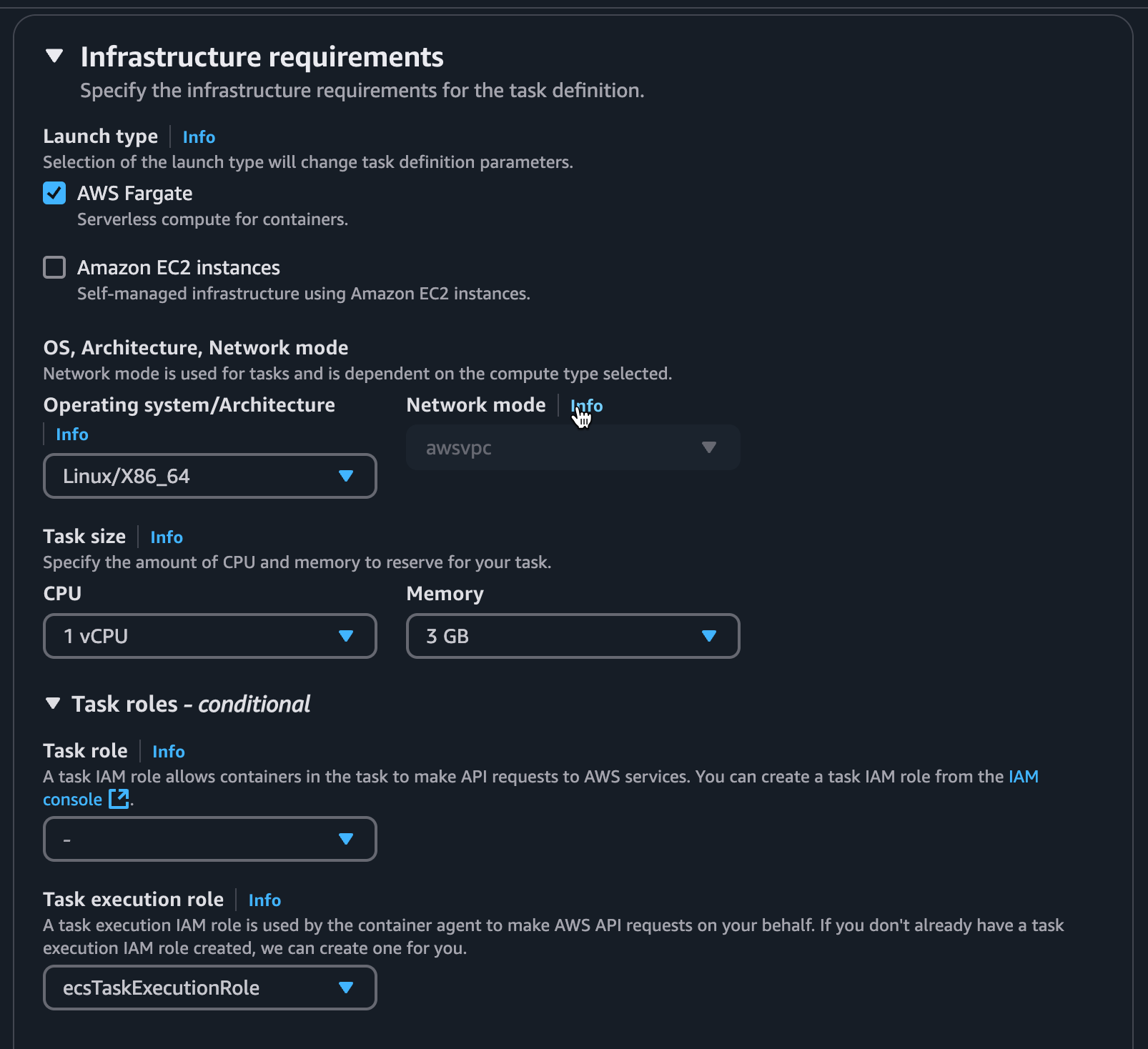 - Choose your infrastructure requirements based on what the application task will need to run in terms of launch type and architecture. You'll also need a task role, which is an IAM role with the permissions to deploy ECS. For more information about this Role and what permissions are needed, check out this link.