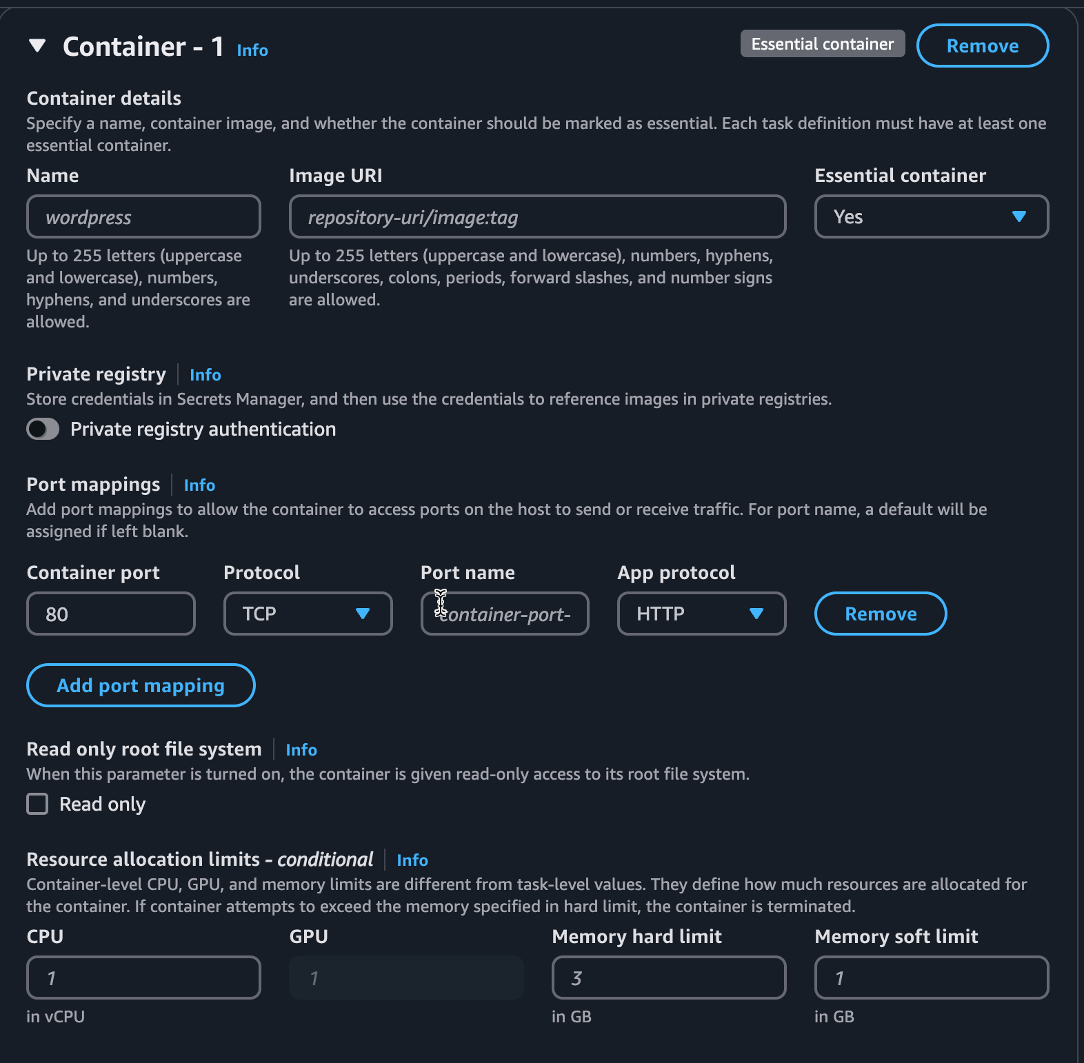 - This is where the magic happens. You can configure the name of the container, the container image path, all of the port mappings, and resource needs (CPU and memory).
