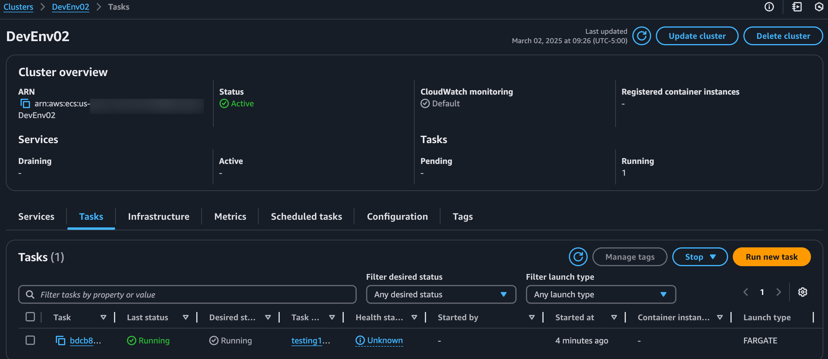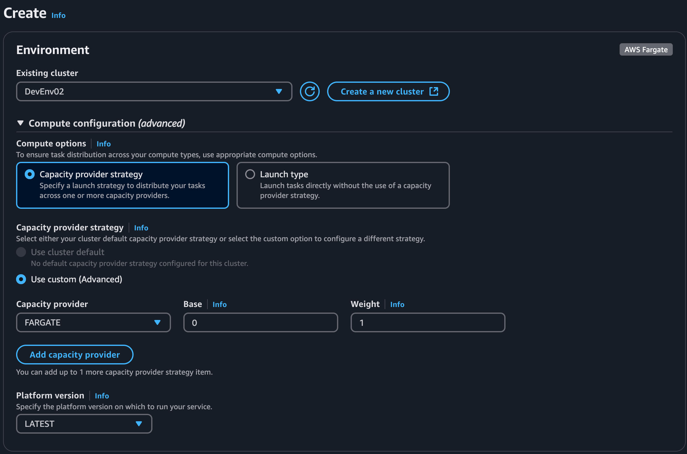 - Configure the environment if anything needs to change, but chances are this can stay as default while you're testing out the deployment. You can, however, change things like the Capacity provider if you have clusters that run both Fargate and EC2.