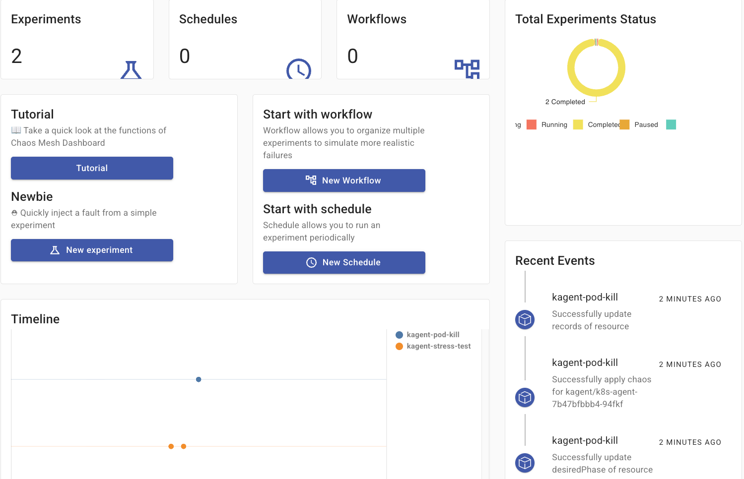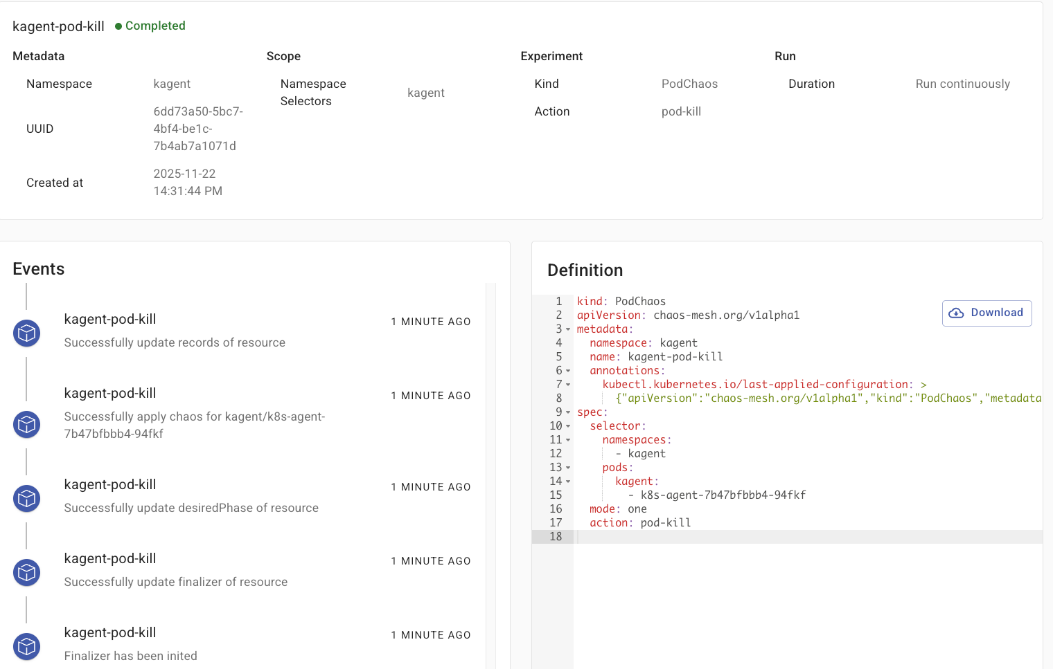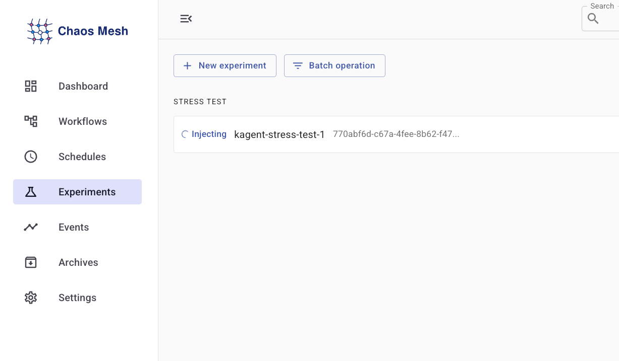 With Chaos Mesh installed, you can start to create Experiments, which are the scenarios/tests you want to run. For example, if you want to test what happens if an Agent Pod goes down, will it recover?