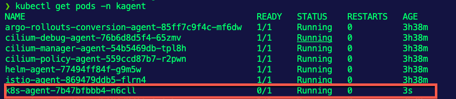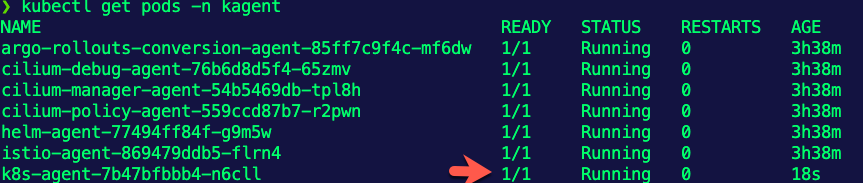 EOF- Run the command below to see the Pods in the kagent Namespace.