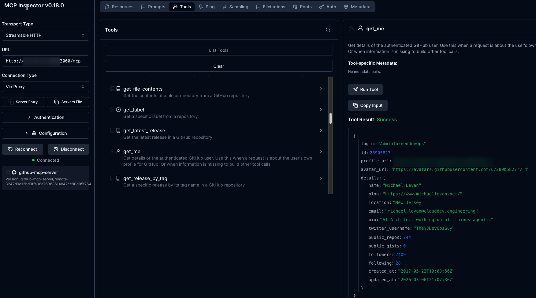 npx modelcontextprotocol/inspector#0.18.0You should be able to see the list of tools within the GitHub Copilot MCP Server.