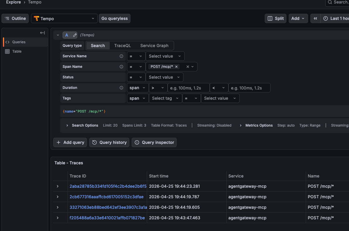 With the Gateway and MCP Server configured and connection tested, it's time to set up the tracing mechanism along with the OTel collector and the ability to view the traces visually. This section will cover how to set up tempo, an OTel tracing collector, and kube-prometheus.