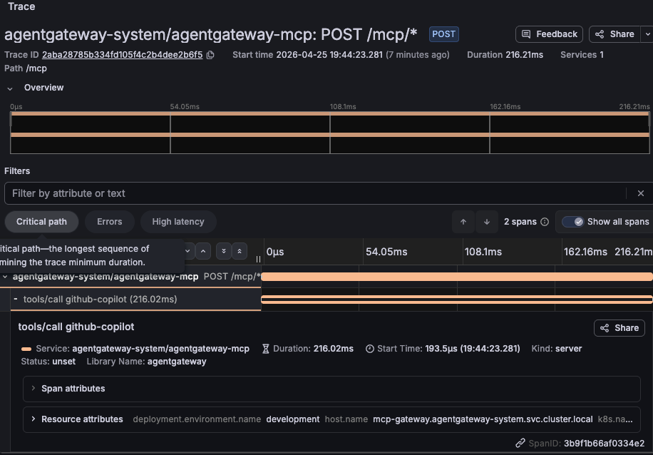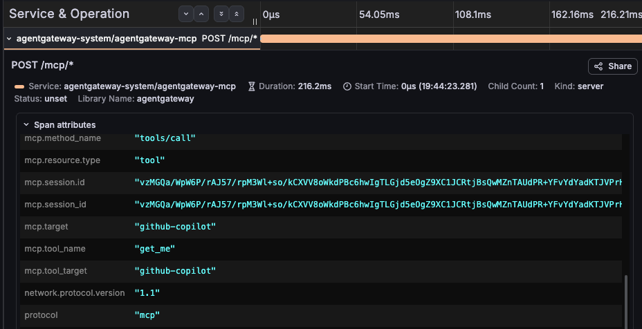 expression: 'default(mcp.methodName, "")'Agentgateway emits base traces, but with the above, you can enrich the trace output with MCP-specific details.