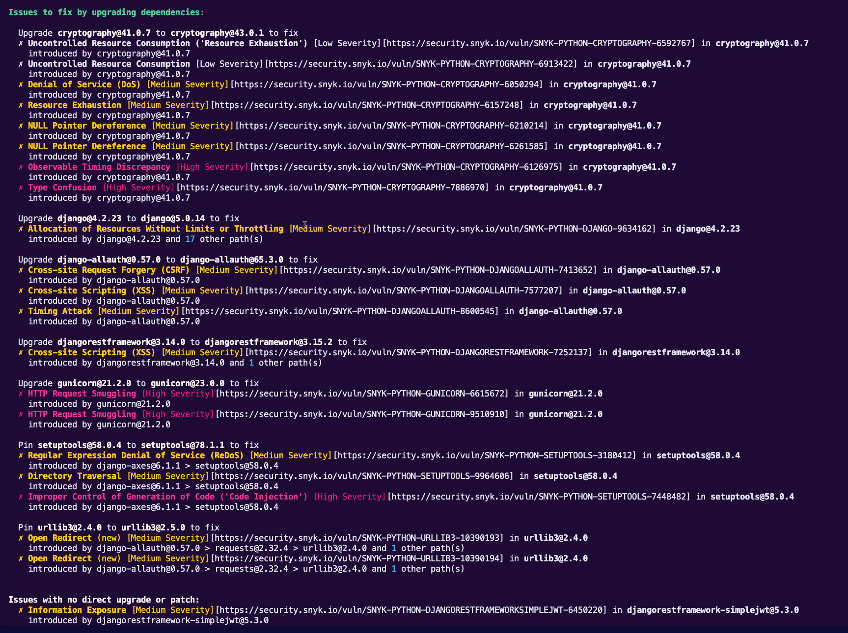 Make this application as secure as possible following best practices for Python, Django, and overall AppSec. Check out the latest CVEs, look into reports like CIS, and confirm you aren't building any code with known exploits from MITTRE.Once the code is generated, run the following command, which scans the dependencies.