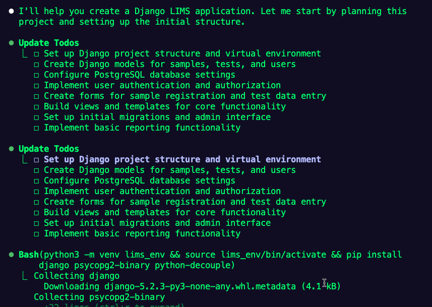 Within test 1, you'll see the prompt below includes the creation of a Django-based application for LIMS, which is a laboratory software.