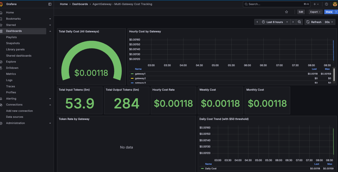 curl -s 'http://localhost:9090/api/v1/query?query=agentgateway:input_tokens:total' | jq '.data.result[0].value'- Check the overall cost.