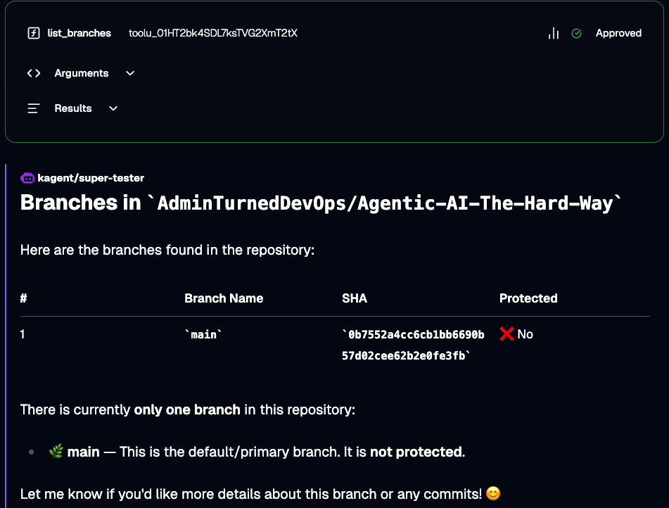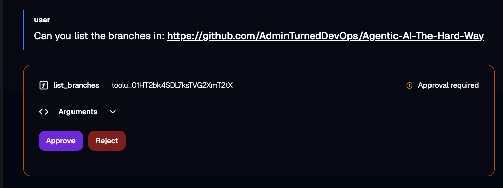 - Prompt the Agent with a "Can you list the branches in" a specific repository, like in the example below. When you run it, you'll see an "Approve" button and a "Reject" button. Click the Approve button.