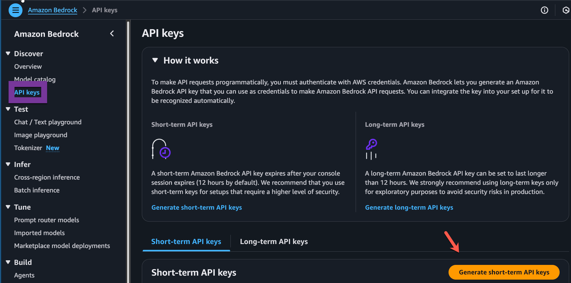 +---------------------------------------------------+------------------------ Next, go into AWS Bedrock and generate an API key. Although you have access to your AWS account, there's a separate API key needed to access LLMs via AWS Bedrock.