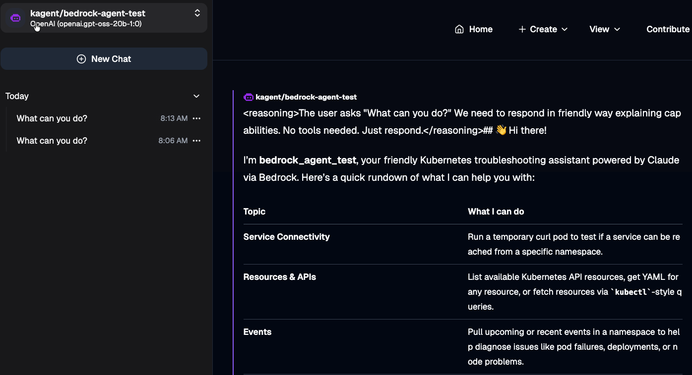 kubectl get modelconfig bedrock-model-config -n kagent -o jsonpath='{.status.conditions}' | jqYou'll see an output similar to the below:
