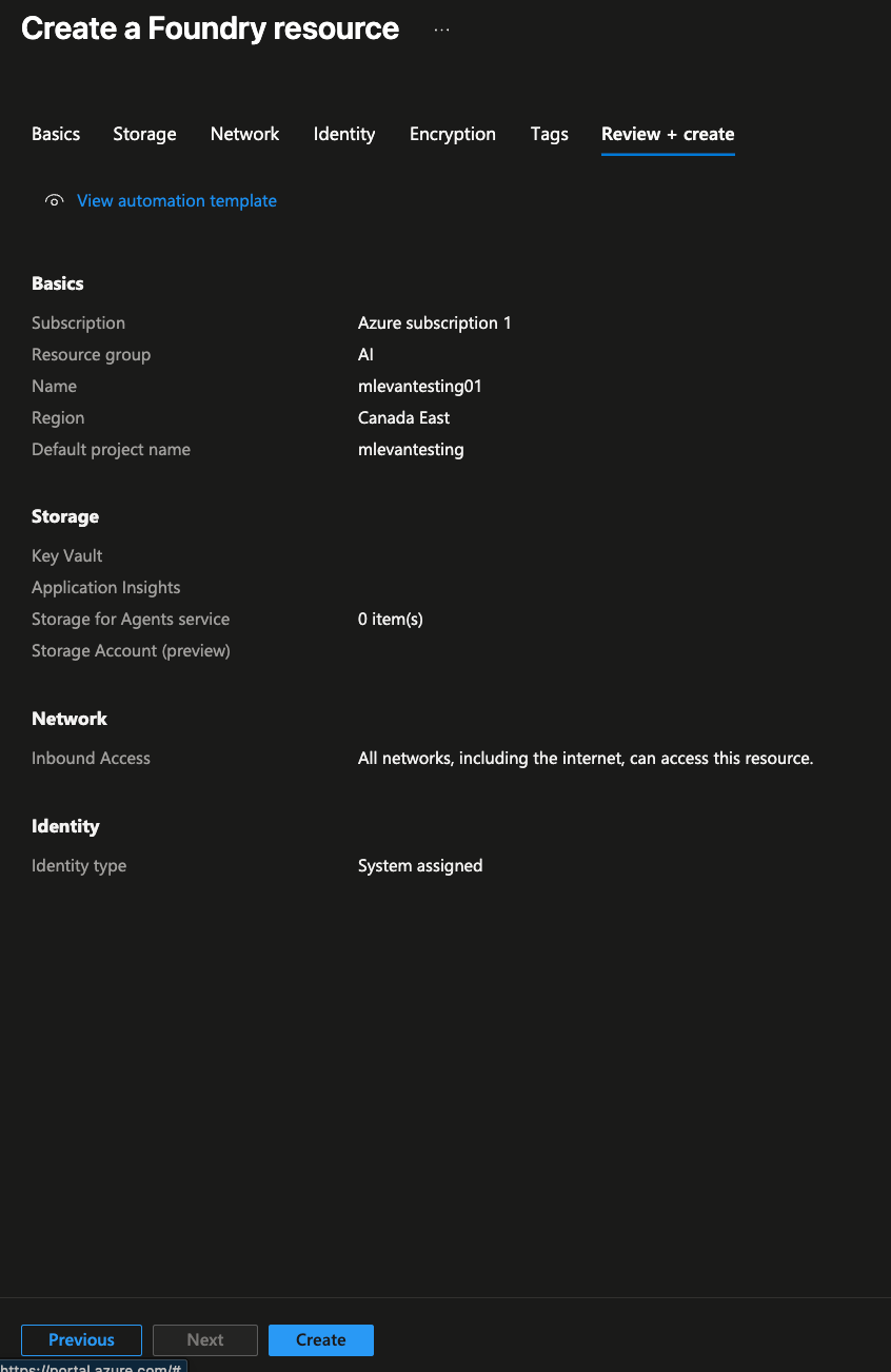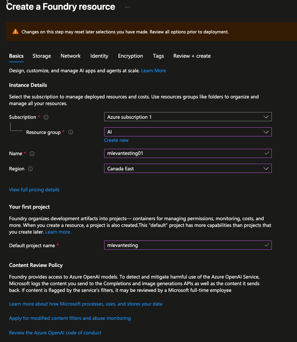 - Create a new Foundry resource. You can keep it basic, but the key thing is to ensure the region it's running in. Because we're deploying this environment to be multi-region, you'll want Foundry to be in a different region in comparison to your k8s clusters.