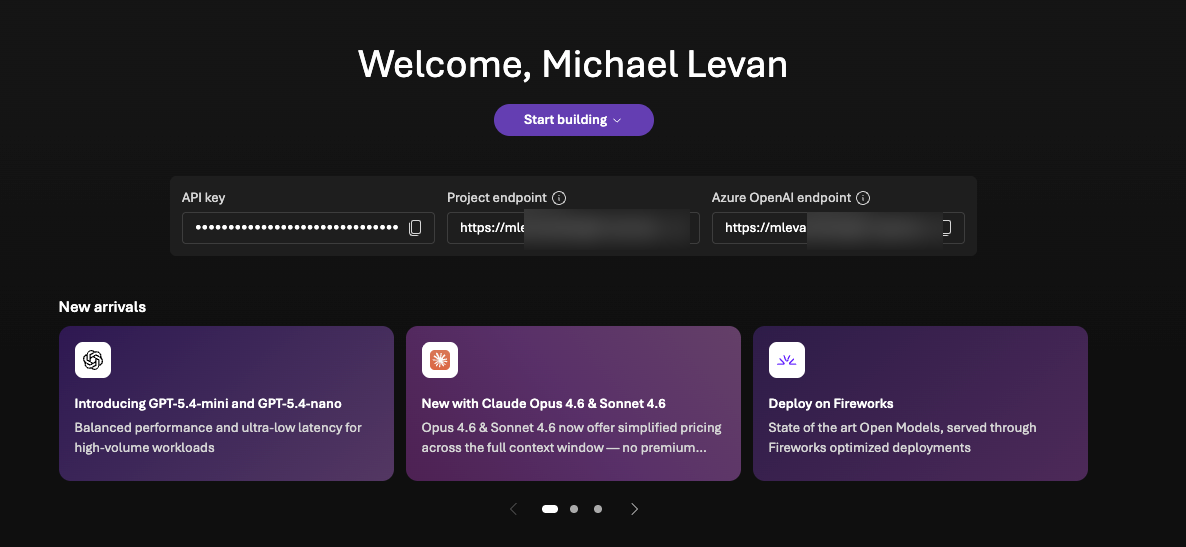 - Click the puruple Start building button and remember to know how to get back to this screeshot because you will need the project endpoint and the API key so agentgateway can route traffic to Foundry (setting up agentgateway will be in an upcoming section).