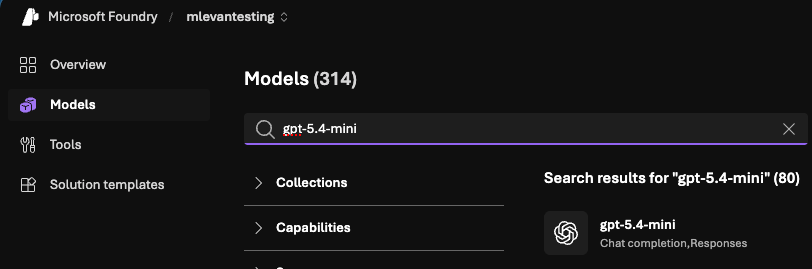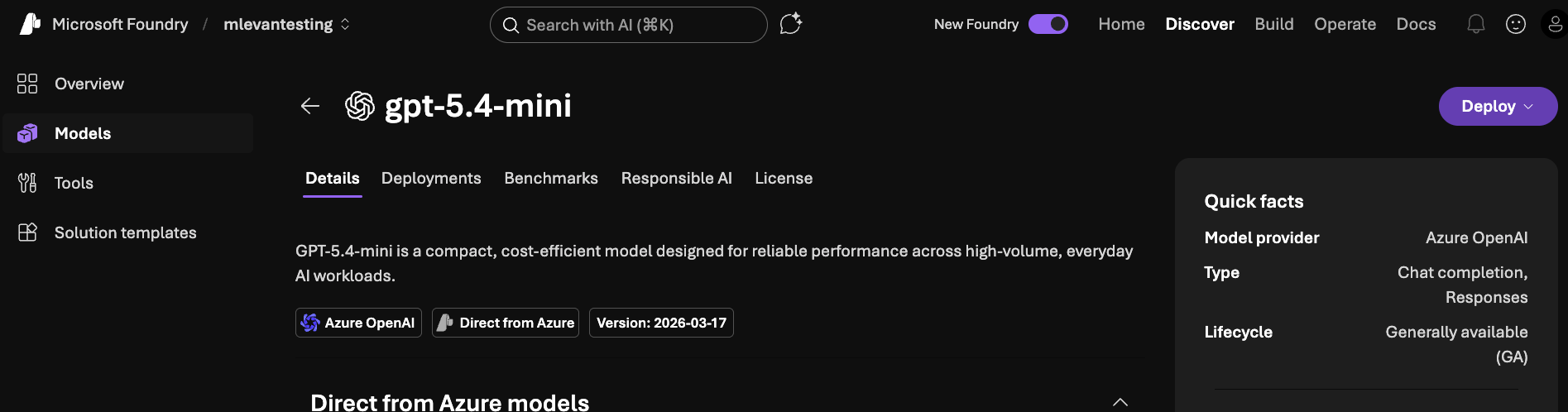 gpt-5.4-miniselected, you can now Deploy the Model by clicking the purple Deploy button. When you click it, you'll see a "deploy with standard" option. Do that unless you have a specific reason not to.