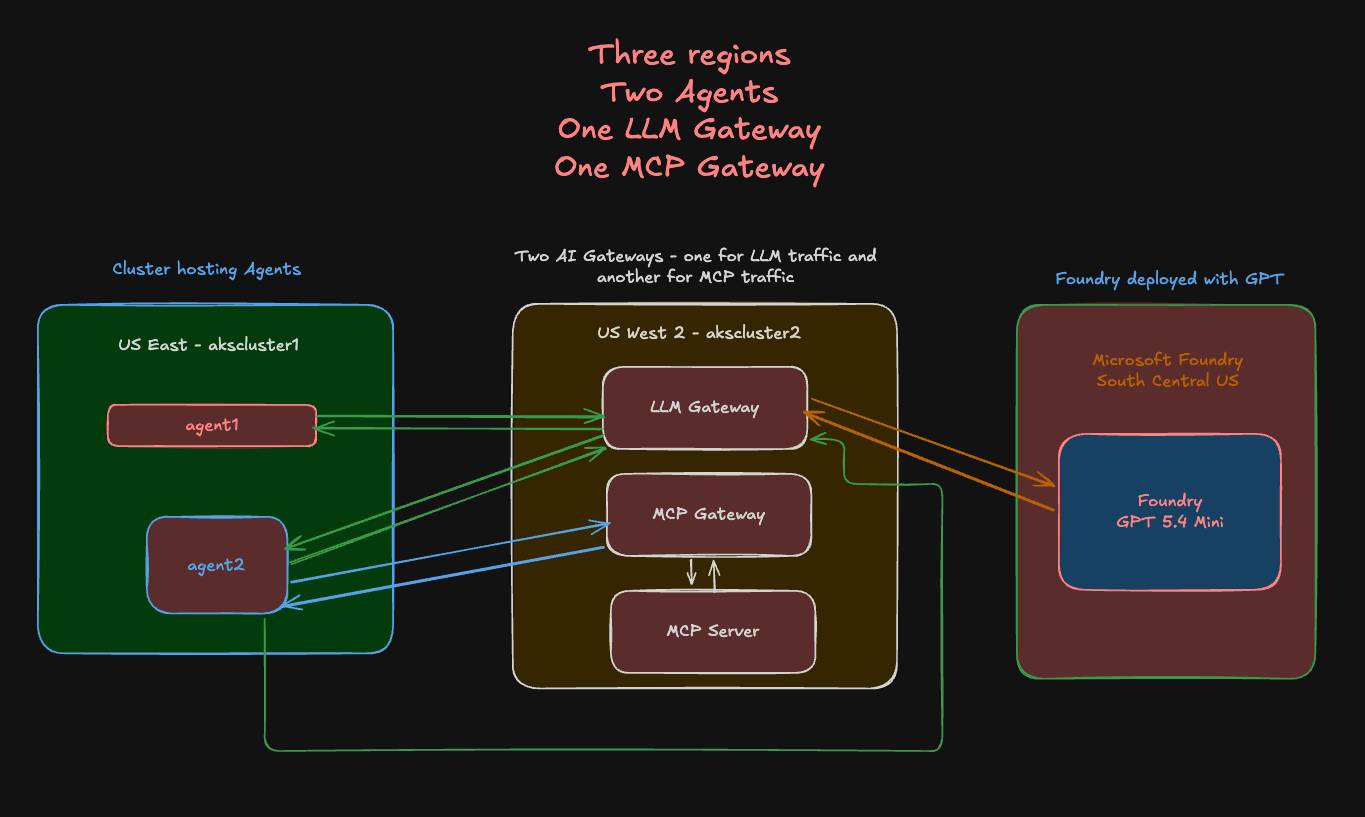 First, let's go over what you'll be building out. On the left, you will see one Azure Kubernetes Services (AKS) cluster running in US East with two Agents running in it via kagent. They are pointing to the LLM Gateway and MCP Gateway, which are running in a second k8s cluster in US West 2. The LLM Gateway is using an LLM (GPT 5.4) that is deployed via Microsoft Foundry in South Central US.