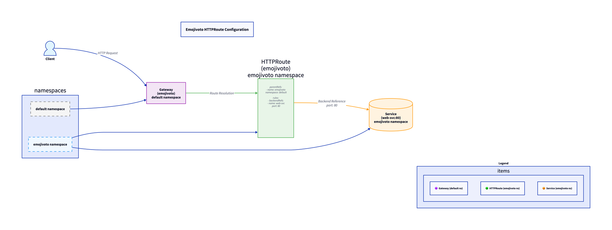 In this case, the HTTPRoute is specified with the backend as the web-svc, which is the primary UI service in Emojivoto. The web-svc Kubernetes Service listens on Port 80, not to be confused with the Kubernetes Gateway API that was set up to listen on port 8080.