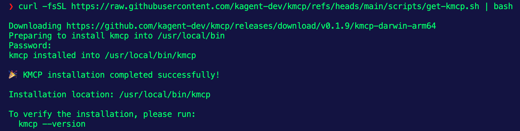 curl -fsSL https://raw.githubusercontent.com/kagent-dev/kmcp/refs/heads/main/scripts/get-kmcp.sh | bash