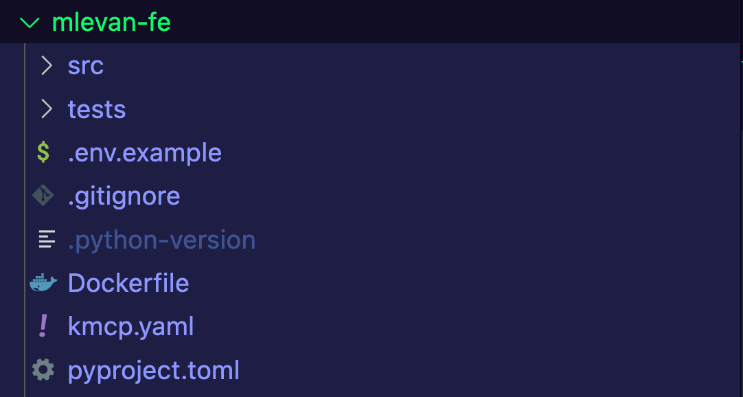 Within the structure, you'll see several files including a Dockerfile and several Python files. You'll learn more about what all of those are in the MCP Codebase Section.