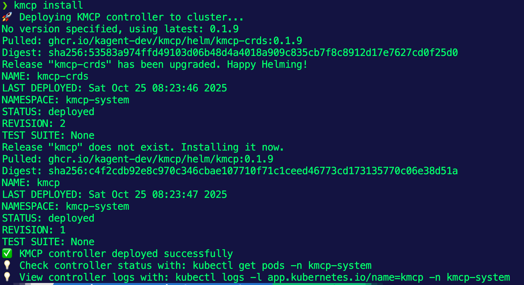 helm install kmcp-crds oci://ghcr.io/kagent-dev/kmcp/helm/kmcp-crds \