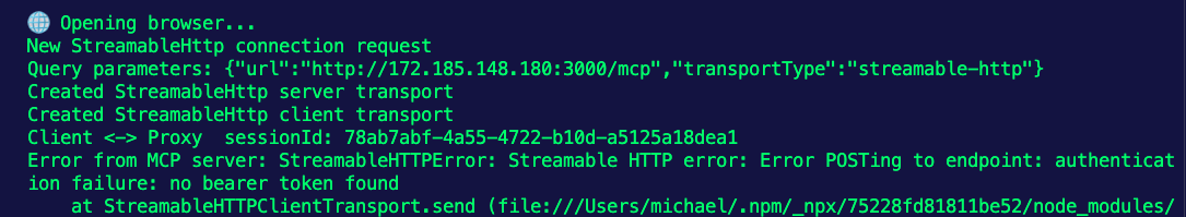Add in the URL via Streamable HTTP- Click Connect in the MCP Inspector UI and in the terminal, you'll see an error similar to the below: