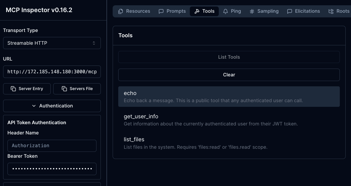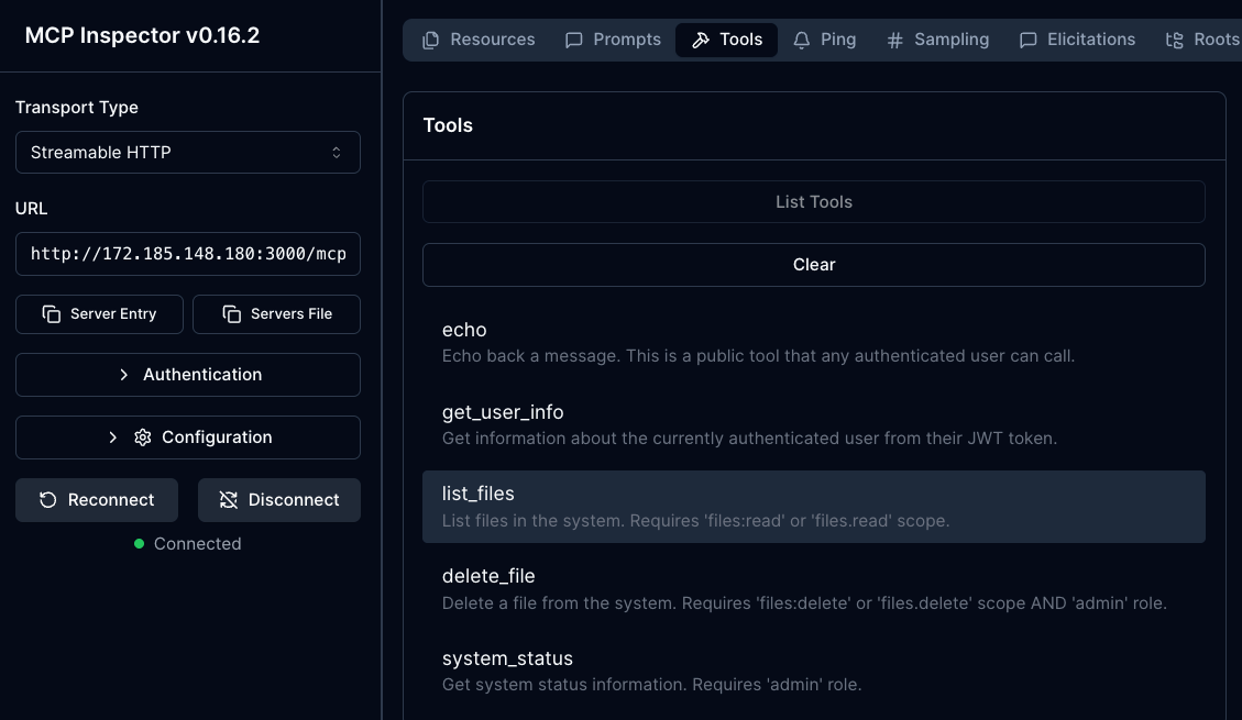 npx modelcontextprotocol/inspector#0.16.2- Connect to your server the same way you did in the Testing MCP Server Connectivity Without oAuth section.