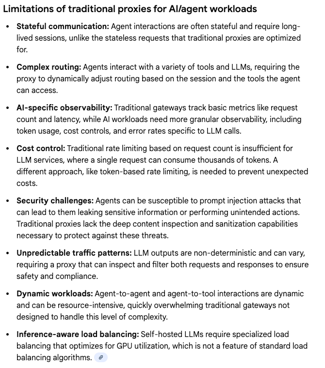This is an important question - why another Gateway? There are already several available. The majority of Gateways that are out now were built using Envoy Proxy, which is a microservice-based Proxy that has been around for a long time and is quite good (arguably the best proxy-based implementations made before AI). Envoy, however, was designed with stateless microservices in mind.