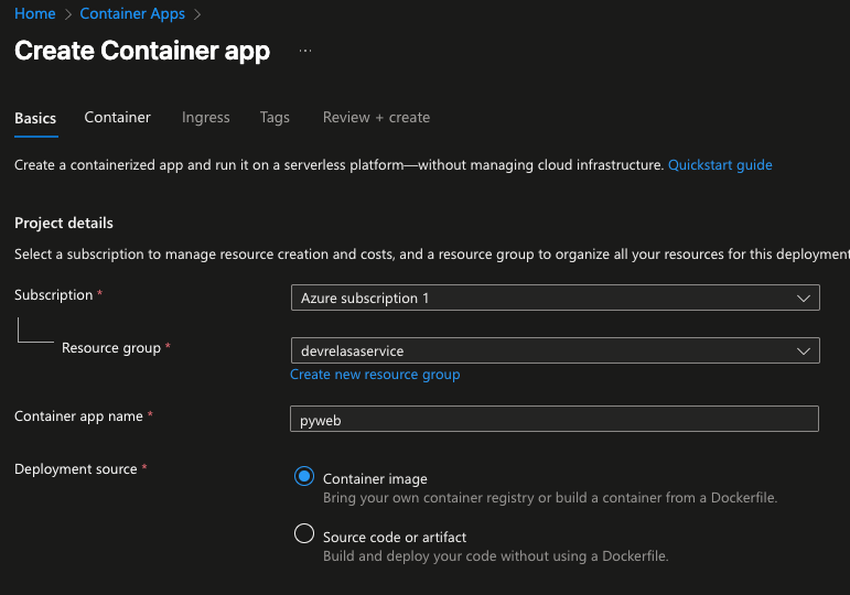 - Input your subscription name and resource group along with an app name of your choosing. You'll also need to choose Container image for the Deployment Source.