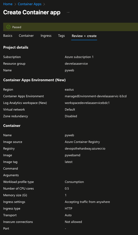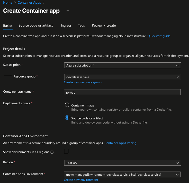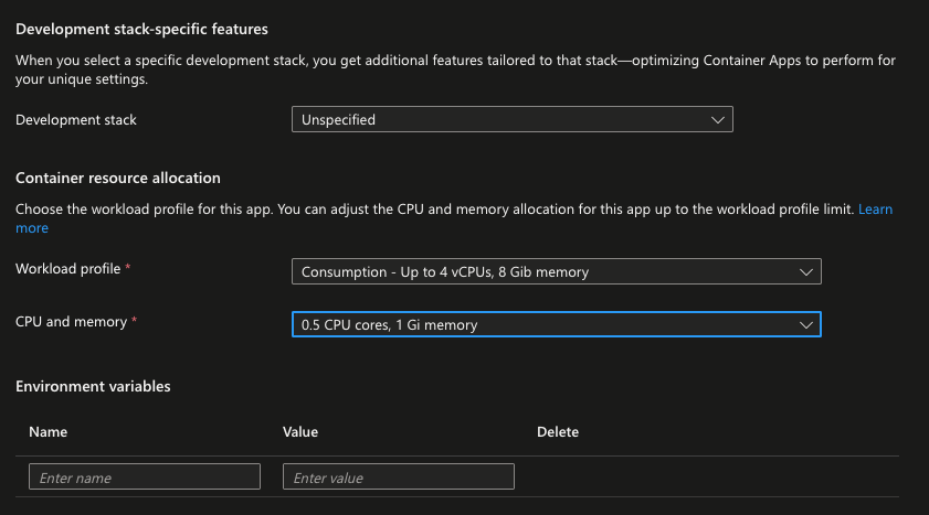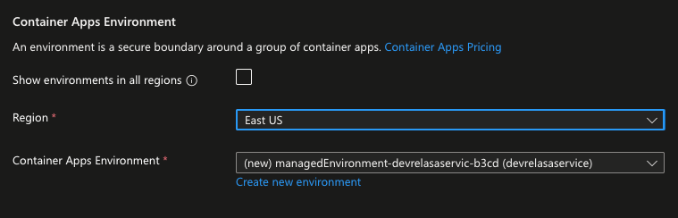 - Create a new ACA environment (it's where ACA runs, you don't have to manage it) and the region where you want the environment to be deployed to.