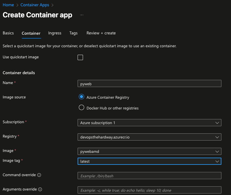 If you don't have a container image readily available, you can choose the Use quickstart image option.