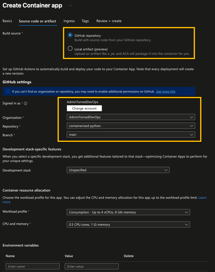 - Specify your Git org, repo, and branch. You can also choose to upload an artifact which is a preview feature in ACA.