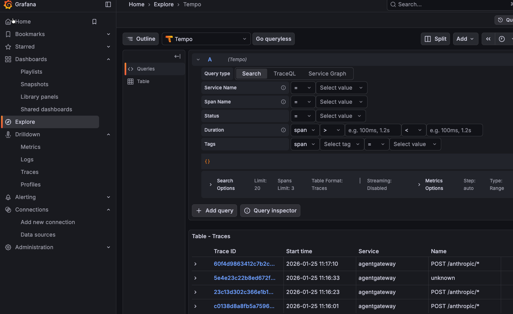 - Search for traces by service name agentgateway.