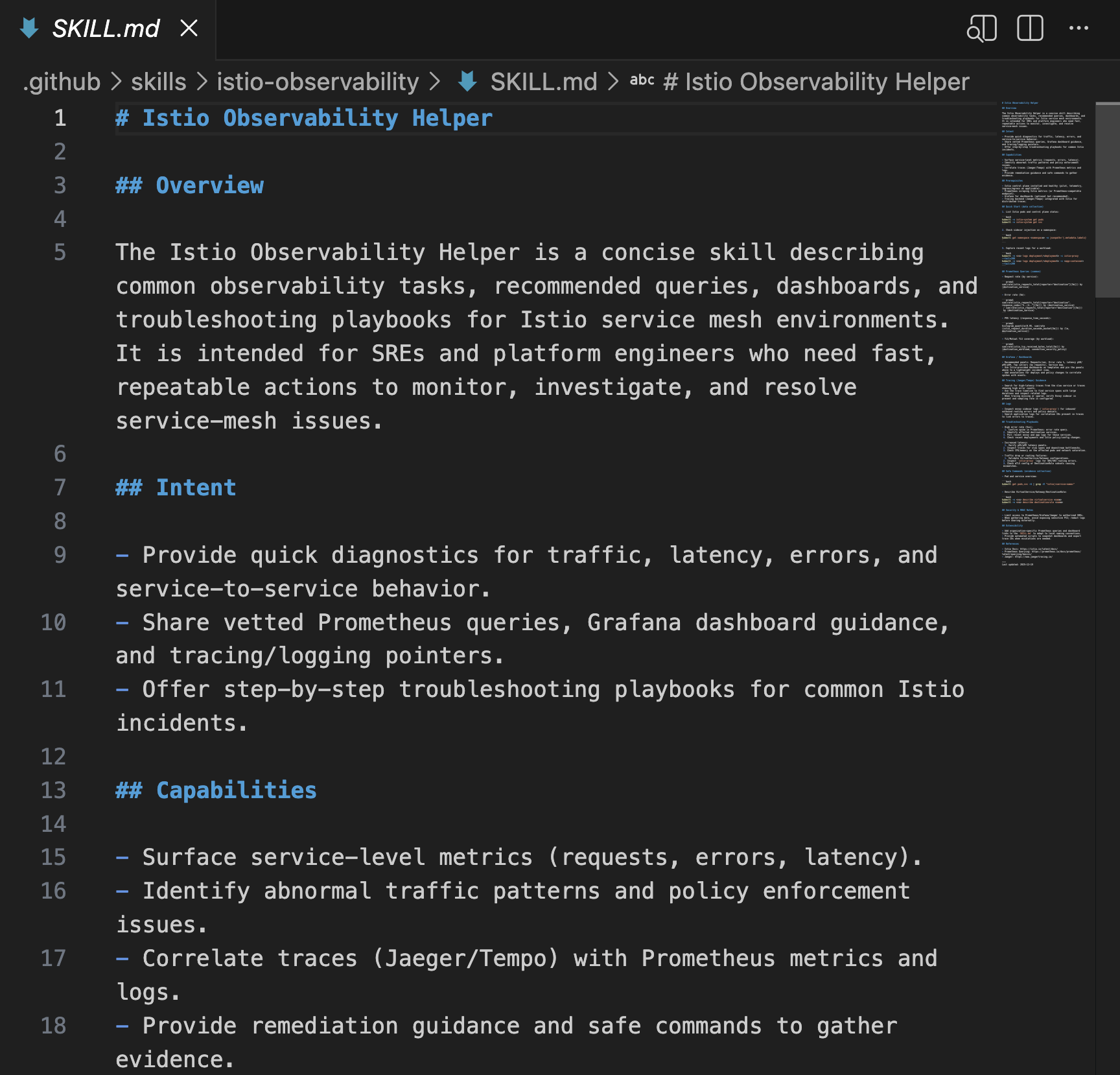 - an `examples` directory that has examples for this skillPutting it all together, you should now have a good prototype Skill for Istio observability.